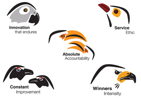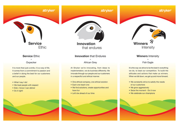 Each of Stryker's internal values were matched with a bird that exhibited these qualities. Logos and posters were designed for each one and revealed over a 5 month employee training period.